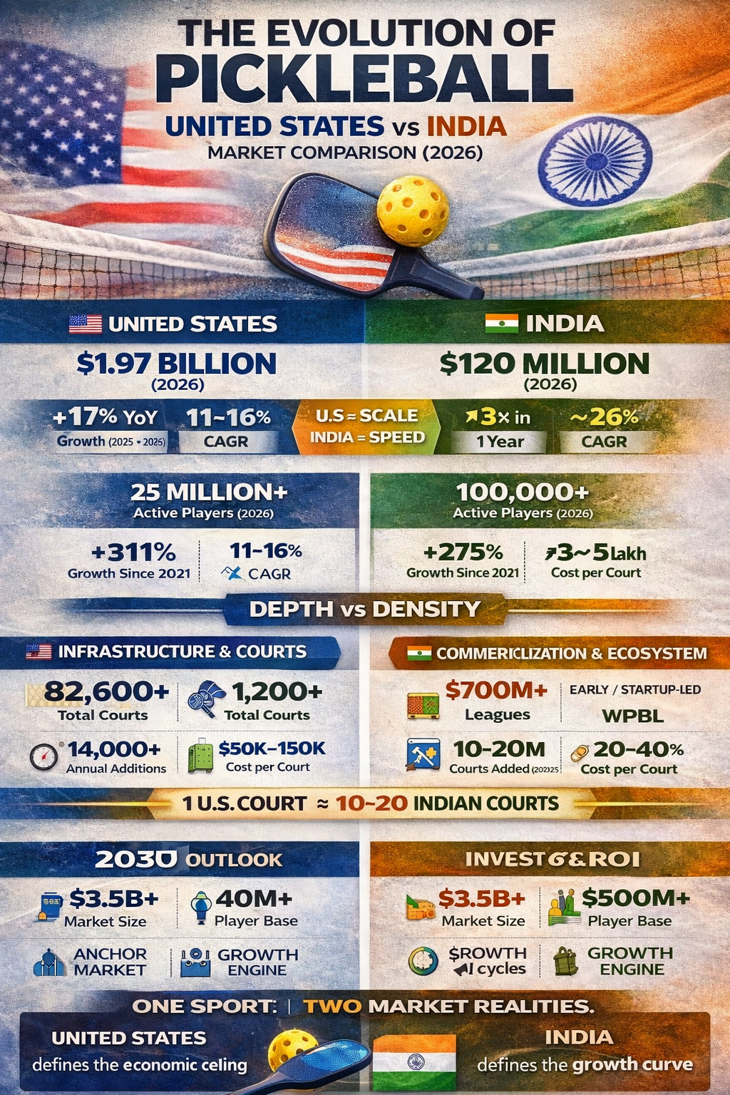 In 2026, pickleball is no longer just a sport—it is a global sports economy in motion, with the U.S. as its anchor and India as its accelerator.